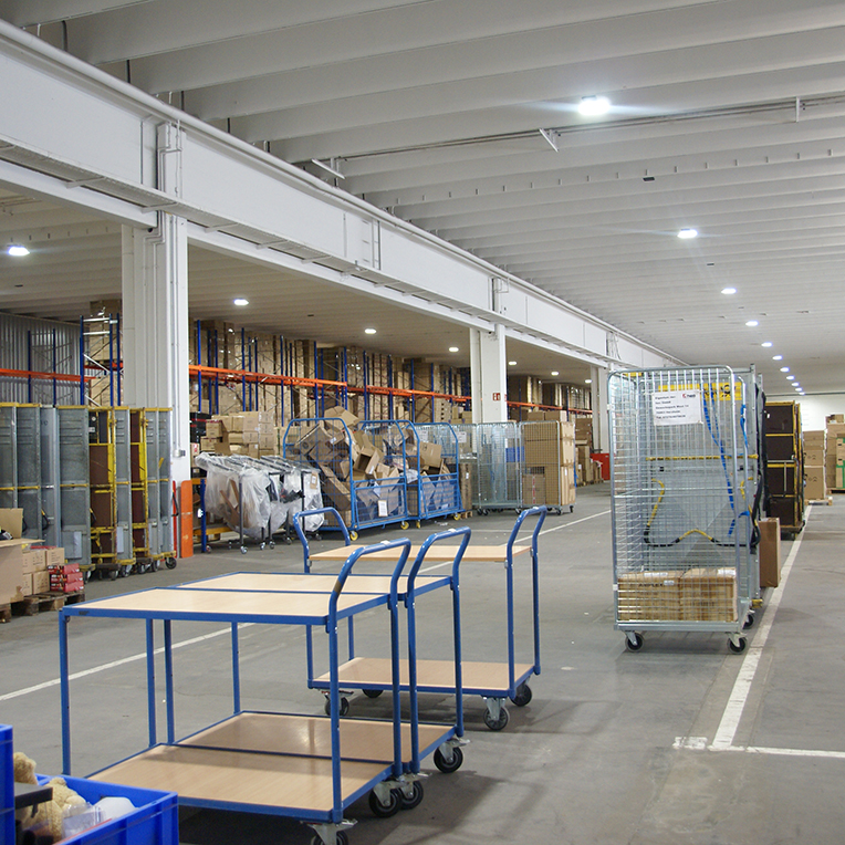 Dank signifikantem Wachstum in den letzten Jahren wurde eine Logistikerweiterung für die Herxheimer Unternehmer notwendig. Die in die Jahre gekommene Hallenbeleuchtung mit Halogentechnik war nicht nur energetisch ineffizient, vielmehr wurden die Lichtverhältnisse in der Miethalle den Anforderungen eines modernen Unternehmens nicht mehr gerecht. Benötigt wurde eine LED Lösung für Flächenbeleuchtung aus 8 Meter Installationshöhe, die an die bisherigen Lichtpunkte montiert werden konnte. Unter Berücksichtigung der Energiekosten und nach einer Lichtplanung war die optimale Lösung gefunden – EiKO LED STAR Disc Strahler.